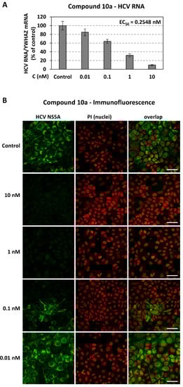 The potency of compound 10a measured by the luciferase assay in HCV GT 1b was confirmed at the level of viral RNA and NS5A protein expression. Huh5-2 replicon cells were treated with 10a in serial dilutions, or its solvent DMSO (control), and viral RNA was quantified by reverse transcription-quantitative polymerase chain reaction (RT-qPCR). NS5A protein levels were evaluated by indirect immunofluorescence combined with confocal microscopy analysis. HCV RNA replication was reduced in the presence of the compound with EC50 = 0.25 nM (Figure 6A), which is close to the one determined in the luciferase assay (EC50 = 0.10 nM). A consistent reduction of NS5A expression was detected, as shown in Figure 6B, in a dose-dependent manner. Nuclei were stained with propidium iodide (PI) as a cell viability control.