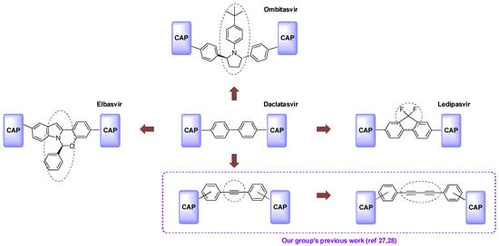 All reported NS5A inhibitors have a long-established design of highly symmetrical pharmacophore structures, commonly bearing bis-pyrrolidine caps along with other structural features, such as linker length, as well as substituents attached to the caps that affect target activity and spectrum [34].