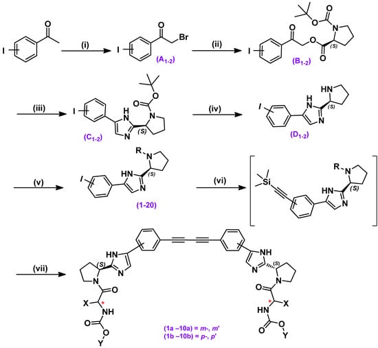 In compound series (1a–10a), Figure 1, the imidazole-proline-carbamate caps were connected to the core at meta-meta positions, while in compound series (1b–10b) they were connected to the core at para-para positions, in an attempt to reach the ideal length and the most promising spatial orientation. Additionally, we planned to investigate the effect of cap chemical composition and stereochemistry on the potency of synthesized compounds, as it affects the compound’s conformation in space, as well as its interactions with the protein. We investigated the effect of the most commonly used amino acid carbamates caps, such as L/D-valine, L/D-leucine, and L/D-phenyl glycine, on the potency of the compounds, while the terminal alkyl carbamate moiety varied between methyl, ethyl, and butyl.