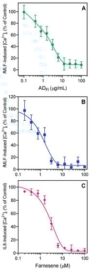 Since Artemisia essential oils and individual compound components exhibited only weak neutrophil activation, we considered whether they might have some effect on neutrophils activated by strong agonists, such as N-formyl peptide receptor 1 (FPR1) agonist fMLF and FPR2 agonist WKYMVM, as ligands can downregulate or alter neutrophil responses to subsequent treatment with heterologous or homologous agonists []. As shown in Table 3, Artemisia essential oils were relatively more potent inhibitors of [Ca2+]i in fMLF- and WKYMVM-stimulated neutrophils, with some IC50 values in the low micromolar range. Essential oils from A. dracunculus flowers (ADFl) were the most potent, with IC50 values of 2.2 and 2.9 μM for inhibition of fMLF- and WKYMVM-induced neutrophil [Ca2+]i, respectively. Representative data showing dose-dependent inhibition of fMLF-induced neutrophil [Ca2+]i, by ADFl are shown in Figure 1A.