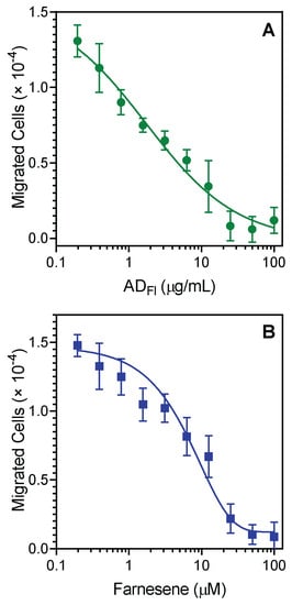 Since A. dracunculus essential oils and their unique component, farnesene, were effective inhibitors of agonist-induced neutrophil [Ca2+]i, we evaluated their effects on neutrophil chemotaxis. Pretreatment of neutrophils with ADFl for 30 min dose-dependently inhibited fMLF-induced human neutrophil chemotaxis toward fMLF, with an IC50 of 2.4 ± 1.1 µg/mL (Figure 2A). Likewise, pretreatment of neutrophils with farnesene also effectively inhibited neutrophil migration toward fMLF, with an IC50 of 3.3 ± 1.4 μM. A representative dose-dependent response for the inhibition of fMLF-induced chemotaxis in human neutrophils by farnesene is shown in Figure 2B. Analysis of (±)-bornyl acetate showed that this compound also inhibited fMLF-induced neutrophil chemotaxis, although with much lower potency (IC50 = 11.9 ± 1.9 μM). In contrast, xanthoxylin did not affect this response.