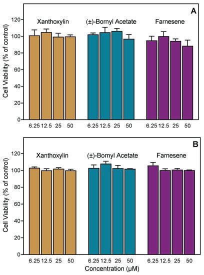 To ensure that Artemisia essential oils or active pure compounds were not cytotoxic, we evaluated the cytotoxicity of the essential oil samples (up to 55 µg/mL) and test compounds at various concentrations (up to 50 µM) in human neutrophils during a 1.5 h incubation period, which covers the times used to measure Ca2+ influx (up to 30 min) and cell migration (up to 1.5 h). As shown in Table 3, essential oils from A. tridentata, A. ludoviciana, and A. cana had no cytotoxicity in neutrophils, although essential oils from A. dracunculus and A. frigida had a little cytotoxicity at the highest concentrations (25–50 μM), which were >10-fold higher than those required to induce biological effects. The pure compounds (±)-bornyl acetate, farnesene, and xanthoxylin were nontoxic in human neutrophils during the 90 min incubation. In addition, these compounds did not affect the viability of human THP-1 monocytic cells after a 24 h incubation period (Figure 3). Thus, the biological effects of these compounds on neutrophil function are not due to compound cytotoxicity and support the conclusion that farnesene is a novel innate immunomodulator.