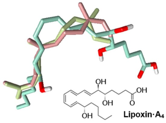 Chemical structure of lipoxin A4 and alignment of lipoxin-A4 (green), (E,E)-α-farnesene (pink), and (Z,E)-α-farnesene (khaki).