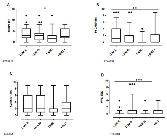 Protein expression level in the different molecular BC subgroups. (A) NLRP3 expression. (B) PYCARD expression. (C) CyclinD1 expression and (D) MYC expression by Anova test. IRS: Immuno Reactive Score. The IRS was calculated by the product of the proportional score (PS) obtained from the percentage of positive cells and the intensity of the staining (see materials and methods section). Values are expressed as a median (horizontal bold line in each box), dot indicates outliers. * p < 0.05; ** p < 0.01; *** p < 0.001.