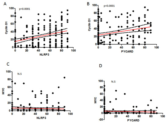 The Spearman correlation test on continuous variables, showed a statistically significant direct relation of CyclinD1 with NLRP3 (r: 0.366; p < 0.0001), and with PYCARD expression (r: 0.285; p < 0.0001) (Table 3 and Figure 3). In the other cases, we did not observe any significant correlation.