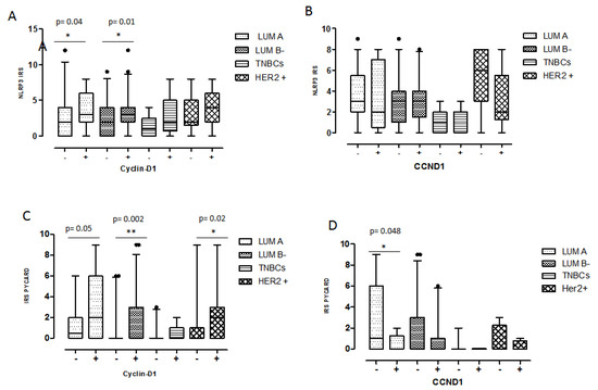 To better investigate a possible interaction of CyclinD1 and the inflammasome pathway, we studied the association of NLRP3-/CyclinD1- and NLRP3+/CyclinD1+ phenotypes versus the clinicopathological features. A higher expression of NLRP3 and CyclinD1 (NLRP3+/CyclinD1+) was associated with older patients (p = 0.0289), with positive ER and PgR expression (p = 0.0016 and p = 0.026). Taking into account, instead, the interaction of CyclinD1 and PYCARD, a higher expression of them (PYCARD+/CyclinD1+) was associated with positive ER expression as well (p = 0.0017), and to higher Ki67 expression (p = 0.032) (Table 4A). The analysis was also performed considering both the inflammasome proteins in combination with CCND1 gene alterations with respect to the clinicopathological features. In detail, the only significant result was the statistical association between PYCARD+/CCND1+ cases and the positive node status (p = 0.033) (Table 4A). The distribution analysis of CyclinD1 and CCND1 negative and positive cases with respect to the inflammasome proteins in the different molecular groups revealed a higher NLRP3 expression in CyclinD1 positive cases in the Luminal phenotype (Luminal A p = 0.04 and Luminal B- p = 0.01) (Figure 4A). No statistically significant differences were observed with respect to CCND1 (Figure 4B). PYCARD was more expressed in CyclinD1 positive cases in the Luminal B- (p = 0.002) and HER2+ subgroups (p = 0.02) (Figure 4C). Regarding PYCARD and CCND1 gene alteration, we observed a slightly higher PYCARD positivity in CCND1 negative Luminal A cases (p = 0.048) (Figure 4D).