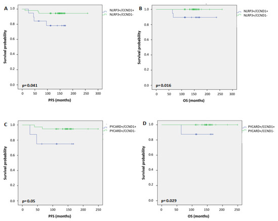 Kaplan–Maier curve analysis. (A) Kaplan–Maier curve for progression-free survival (PFS) according to NLRP3+/CCND1+ versus NLRP3+/CCND1− patients (p = 0.041). (B) Kaplan–Maier curve for overall survival (OS) according to NLRP3+/CCND1+ versus NLRP3+/CCND1− patients (p = 0.016). (C) Kaplan–Maier curve for PFS according to PYCARD+/CCND1+ versus PYCARD+/CCND1− patients (p = 0.05). (D) Kaplan–Maier curve for OS according to PYCARD+/CCND1+ versus PYCARD+/CCND1− patients (p = 0.029).