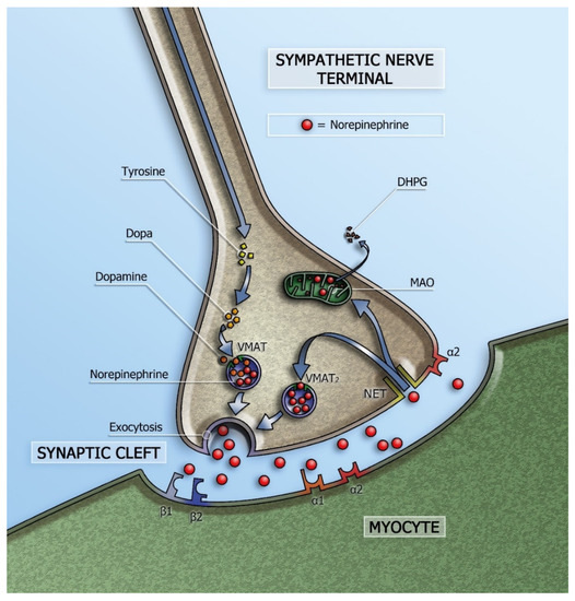 Schematic representation of the sympathetic synapse. Norepinephrine is synthesized within neurons by an enzymatic cascade. Dihydroxyphenylalanine (DOPA) is generated from tyrosine and subsequently converted to dopamine by DOPA decarboxylase. Dopamine is transported into storage vesicles by the energy-requiring vesicular monoamine transporter (VMAT). Norepinephrine is synthesized by dopamine β-hydroxylase within these vesicles. Neuronal stimulation leads to norepinephrine release through fusion of vesicles with the neuronal membrane (exocytosis). Apart from neuronal stimulation, release is also regulated by a number of presynaptic receptor systems, including α2–adrenergic receptors, which provide negative feedback for exocytosis. Most norepinephrine undergoes re-uptake into nerve terminals by the presynaptic norepinephrine transporter (NET) and is re-stored in vesicles (following uptake by vesicular amine transporter 2 (VMAT2)) or is metabolized in cytosol dihydroxyphenylglycol (DHPG) by monoamine oxidase (MAO). (Adapted from Verschure et al. [1].