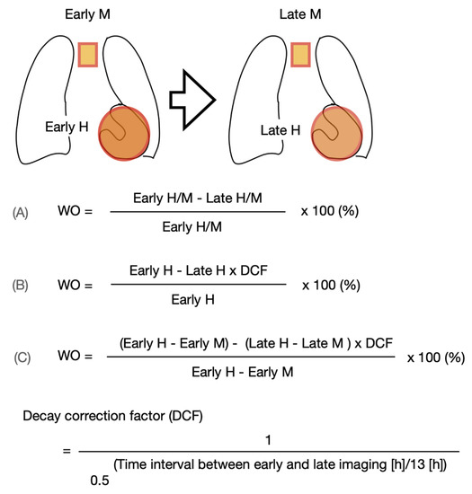 Variations of 123I-mIBG washout (WO) calculation using the myocardial count densities requiring a time decay correction factor (DCF) without (B) or with background correction (C). Calculating the DCF value by the formula of 1/0.5(time/13) for 3.0, 3.5 or 4.0 h, the DCF are 1.17, 1.21 and 1.24, respectively.