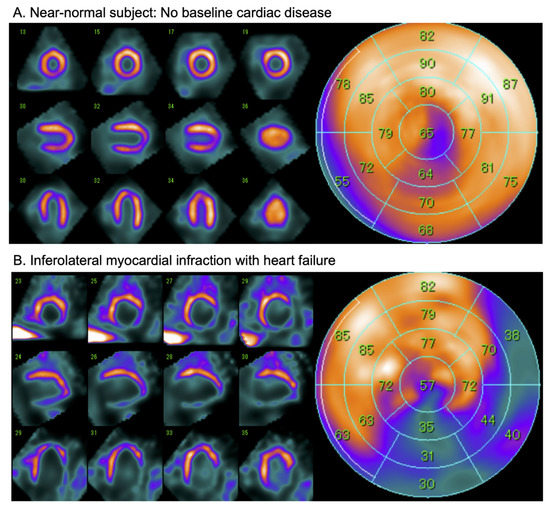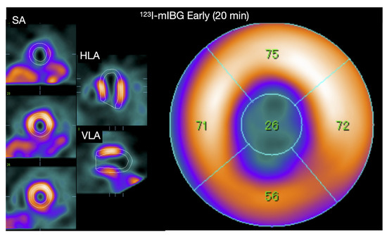 Compared with the H/M derived from two-dimensional planar images, three-dimensional imaging using single-photon emission tomography (SPECT) provides a more complete understanding of regional cardiac sympathetic innervation [32]. Although an officially established method for scoring 123I-mIBG SPECT images is lacking, analysis can be performed similar to conventional 17-segment/5-point model used for SPECT myocardial perfusion imaging (MPI) [33]. An example of SPECT 123I-mIBG images is shown in Figure 4. Furthermore, comparison of cardiac SPECT 123I-mIBG images with MPI can also be useful in specific cardiac pathologies such as ischemic heart disease. More recently, the introduction of dedicated cardiac cameras, equipped with solid-state Cadmium–Zinc–Telluride (CZT) detectors characterized by a higher photon sensitivity and spatial resolution compared to standard gamma cameras allow repeated assessment of cardiac innervation with lower radiation exposure [34]. Furthermore, these CZT detectors allow evaluating myocardial innervation and perfusion in a single session, i.e., dual isotope single acquisition imaging.