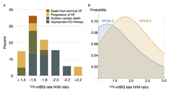 123I-mIBG H/M and breakdown of serious events (A); death from terminal heart failure (HF), progression of HF, sudden cardiac death, and appropriate ICD therapy [67]. The right panel (B) shows machine-learning-based simulation of probability of fatal arrhythmic death. In this simulation a model was created based on patients with documented 2-year outcomes of CHF using 13 variables including age, gender, NYHA functional class, left ventricular ejection fraction and planar 123I-mIBG late H/M ratio [71]. The bell-shape appearance of serious arrhythmic events as observed in clinical studies is replicated by simulation models as well.