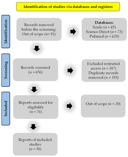 A systematic literature review was conducted by searching three electronic scientific journal databases: Scielo, Science Direct, and PubMed. A search filter was applied to delimit the period between the years 1994 and 2021, and three sets of keywords were utilized: “Arrabidaea and Fridericia”, “Arrabidaea or Fridericia”, and “Arrabidaea and pharmacological applications”. The primary search identified 747 results, of which the articles were selected by excluding conference papers, course completion papers, scientific reports, drafts, and articles that were indexed in two or more databases. The selected articles were manually reviewed to identify and exclude articles that did not meet these criteria, and in the end, 56 articles were selected for this review on the genus Arrabidaea syn. Fridericia. Figure 1 illustrates the selection process.