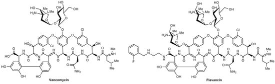 In the novel series of derivatives, eremomycin was conjugated to a hydrophobic arylalkyl group via the carboxamide group [,]. This type of new eremomycin amides are more active than vancomycin against both glycopeptide-sensitive and glycopeptide-resistant Gram-positive strains. The highest activity among the new derivatives was shown by derivatives containing fluorobenzyl groups [], of which the leader compound, N-(2-((o-fluorobenzyl)amino)ethyl)amide of eremomycin (flavancin, Figure 1), was chosen for in-depth preclinical evaluation. A study of its efficacy in a mouse model of staphylococcal sepsis showed that its ED50 is 7.5 times lower than that of vancomycin, and the therapeutic index is 317, which is 2.7 times higher than that of vancomycin [].