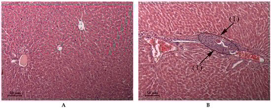 (A,B) Rat liver. (A) Untreated control. (B) Flavancin, 15 × 10 mg/kg/day, 1 day post-treatment. Micronecrotic focus in the vicinity of the triad (1) × 20.