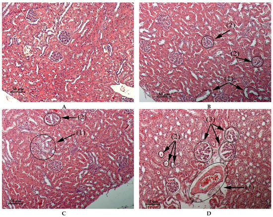 (A–D) Rat kidney. (A) Untreated control. (B) Cortical zone. Flavancin, 15 × 6 mg/kg/day, 1 day post-treatment. Vacuolar dystrophy of epithelium of some convoluted tubules (1). Thickening of the capsule and focal atrophy of the capillary network in glomerulus (2). (C) Cortical zone. Fuvancin, 15 × 10 mg/kg/day, 1 day post-treatment. Small focus of granular and vacuolar dystrophy of epithelium of convoluted tubules (1), clawed glomerulus (2). (D) Juxtamedullary zone. Flavancin, 15 × 10 mg/kg/day, 1 day post-treatment. Perivascular edema (1), destruction in the epithelial layer of some convoluted tubules (2), and clawed glomeruli with a sharply expanded lumen of the capsule (3) × 20.