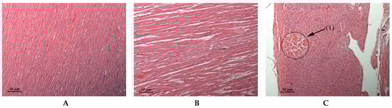 (A–C) Rat myocardium. (A) Untreated control. (B) Flavancin, 15 × 10 mg/kg/day, 1 day post-treatment. Interstitial edema. (C) Flavancin, 15 × 10 mg/kg/day, 1 day post-treatment. Focus of interstitial edema associated with toxic cardiomyopathy (1) × 20.