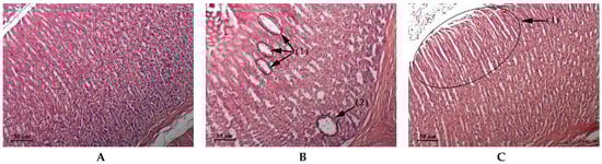 (A–C) Rat stomach. (A) Untreated control. (B) Flavancin, 15 × 10 mg/kg/day, 1 day post-treatment. Sharp expansion of the glands lumen (1) and cyst lined with squamous epithelial cells (2). The parietal cells prevailed in the glands. Destruction of parietal cells in single glands. (C) Flavancin, 15 × 10 mg/kg/day, 1 day post-treatment. Deep focal atrophy of the gastric gland epithelium and replacement of the glandular epithelium by the surface epithelium in this area (1) × 20.