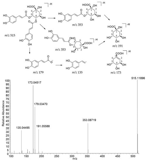 The typical fragmental ions of caffeoyl quinic acid derivatives were preliminarily determined by standards using UHPLC-Q-Orbitrap-MS. Typically, fragmental ions at m/z 191 (C7H11O6−) correspond to [quinic acid–H]−, m/z 173 (C7H9O5−) correspond to [quinic acid–H–H2O]−, and m/z 179 (C9H7O4−) corresponding to [caffeic acid–H]−. The fragment pathway of 4,5-dicaffeoyl quinic acid is shown in Figure 2.