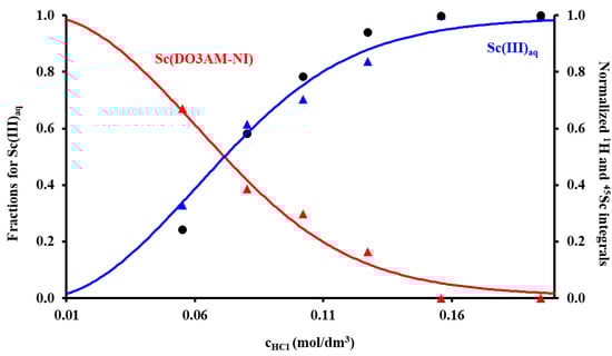 The species distribution of the Sc(III)–DO3AM-NI–H+ system (solid lines) calculated from the equilibrium data obtained by 1H and 45Sc-NMR spectroscopy co-plotted with the normalized intensity of the Sc(III)aq (black dots) and those corresponding to the nitroimidazoyl protons in bound (red triangles) and free (blue triangles) ligand present in solution (3.32 mM ligand and ScCl3, I = 0.15 M NaCl, 37 °C).