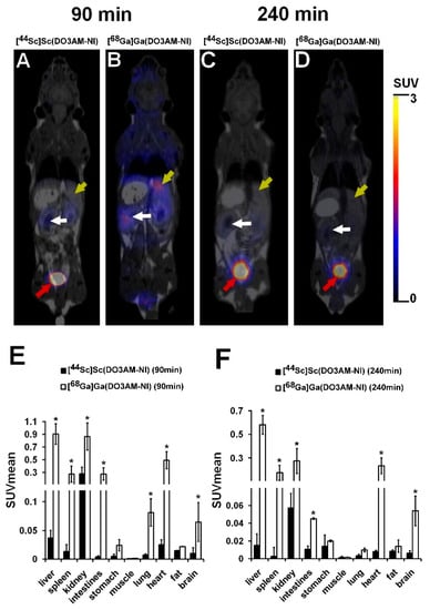 The biodistribution of 44Sc- and 68Ga-labeled DO3AM-NI was investigated using healthy control and KB tumor-bearing SCID mice. PET/MRI imaging and ex vivo studies were performed 90 and 240 min after intravenous injection of 44Sc- or 68Ga-labeled DO3AM-NI. Representative coronal PET/MRI images of a healthy control mouse are shown in Figure 3. By the qualitative analysis of the PET/MRI images, the kidneys and the bladder with urine were clearly visualized using both radiotracers at each investigated time point; however, in other abdominal and thoracic organs, low uptake was observed. After 90 min of incubation time, a relatively high accumulation was observed in the liver using [68Ga]Ga(DO3AM-NI) (Figure 3B). After the quantitative SUV analysis of the in vivo PET/MRI images, we found significantly (p ≤ 0.01) higher [68Ga]Ga(DO3AM-NI) uptake in the liver, spleen, kidney, intestines, lung, heart and brain than that of the [44Sc]Sc(DO3AM-NI) accumulation in the same organs 90 and 240 min after tracer injection (Figure 3E,F).