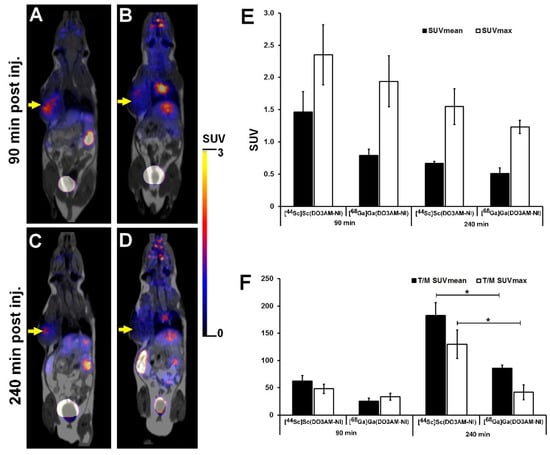 Representative in vivo whole-body PET/MRI imaging of KB tumor-bearing mice using [44Sc]Sc(DO3AM-NI) (A,C) and [68Ga]Ga(DO3AM-NI) (B,D) 90 and 240 min after intravenous tracer injection. Quantitative SUV analysis of [44Sc]Sc(DO3AM-NI) and [68Ga]Ga(DO3AM-NI) accumulation in experimental tumors (E,F). Decay-corrected PET/MRI images and data were obtained 13 ± 1 days after tumor cell inoculation. Yellow arrows: KB tumors. T/M: tumor-to-muscle ratio. Significance level: p ≤ 0.01 (*).