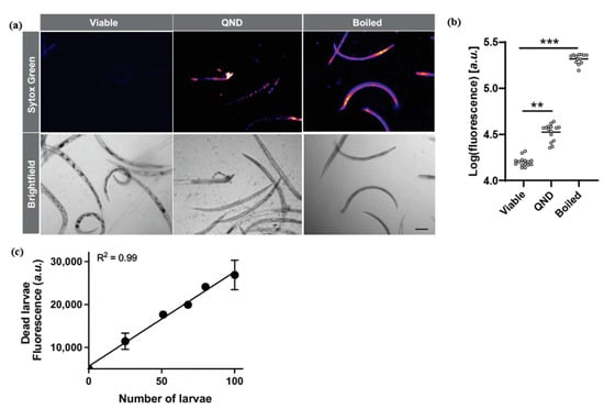 We used an in vitro approach in which: (i) live untreated iL3, (ii) iL3 treated with quinidine, or (iii) boiled (dead) iL3 were incubated with Sytox Green for 24 h, after which we assessed the staining of the larvae using microscopic and spectrophotometric approaches (Figure 1a,b, respectively). For the untreated, live iL3s, no specific fluorescence was detected (Figure 1a) and the dye was confirmed to be both cell- and cuticle-impermeant. Fluorescence microscopy of boiled or quinidine-treated iL3s showed that the dye readily passed through the cuticle and stained the larvae with reduced viability (Figure 1a). Spectrophotometric measurement confirmed that the difference in staining between live and dead larvae could be quantitated, with boiled iL3 giving the higher fluorescence (Figure 1b). By serial dilution of boiled iL3s, we showed a strong correlation between fluorescence measurements and the number of dead iL3s (R2 = 0.99, Figure 1c). Variation in results (standard deviations) between, but not within, experiments was high due to inconsistency of the initial viability of the N. brasiliensis iL3s. Variation among distinct batches of larvae is expected for such nematodes [,].