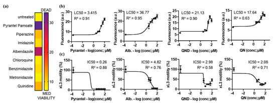 (a) N. brasiliensis iL3s (n = 100) were co-cultured in the presence of RBCs with 100 µM known anthelmintics (pyrantel, piperazine, imidazole, albendazole, chloroquine, benzimidazole, metronidazole and quinidine). After 3 days, Sytox Green was added to the wells and 24 h later, fluorescence (arbitrary units, a.u.) was measured by spectrophotometry. The average of duplicate values for each drug are shown as a heat-map ranging from medium viability (MED) to low viability (DEAD i.e., equivalent to killed by boiling) (arbitrary units a.u.). (b) Drug dilution series for pyrantel, albendazole (Alb.), quinidine (QND), and quinine (QN) using the same assay as described in (a). Data were normalised to those for “dead” controls and pooled from three independent experiments and represented as mean ± standard error of the mean (SEM). The compound concentrations were log10-transformed and fitted using a variable slope four-parameter equation, using ordinary least squares fit model. (c) Using the same conditions as described in (b), motility was assessed by microscopy 4 days after culture. Motility scores were calculated for individual compounds, normalised with reference to the negative control (100% motility) and recorded as percentages. Data points represent one experiment conducted in triplicate; mean ± standard error of the mean (SEM).