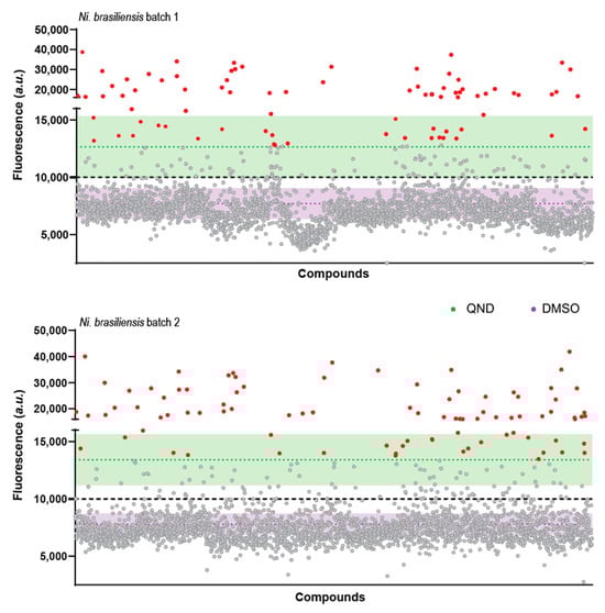 Results of the primary screen of a natural compound library (n = 2654) against third-stage larvae of Ni. brasiliensis with reference to quinidine as positive control (QND; 32 replicates per plate) and to DMSO 1% as negative control (DMSO, 32 replicates per plate). All compounds were screened in duplicate using different batches of the parasite (top or bottom panel). All values were normalised for each plate to mean (DMSO) + 3 ∗ SD(DMSO) = 10,000 units (Dashed black line). All compounds and positive controls were tested at 100 µM. Each grey or red dot represents an individual test compound. Mean +/− standard deviation (dashed coloured line +/− coloured zone) for controls were calculated as an average of all replicates (n = 224) and are indicated in green for QND and purple for DMSO. Red dots are hits identified (as described in Figure S1).