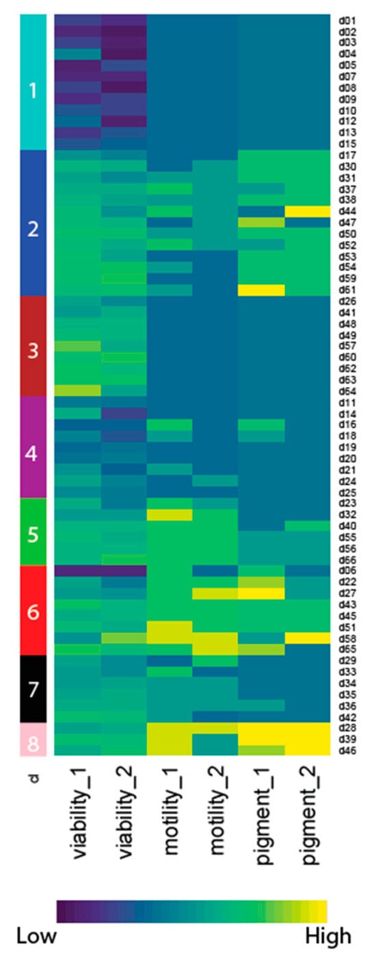 Comparative heat-map of hits displaying scaled readouts for viability, motility, and pigmentation is shown (two duplicates for each drug and two different batches of larvae, “1” and “2” were used). Viability: 40 iL3 per well were incubated with compounds of interest at 100 µM for 4 days. After 72 h, Sytox Green was added to the culture and viability was acquired by spectrophotometric measurement 24 h later. Motility: compounds with an effect that was greater than that obtained for the reference compound (QND) were further scored for motility under bright-field microscopy. Pigmentation: Compounds with an effect that was greater than that obtained for the reference compound (QND) were also scored under bright-field microscopy for the presence/degradation of a hemozoin-like compound. All measurements were performed in the same experiment. Values were Z-scored for each readout (centred of the mean of the data), negative Z-scores (lower fitness) are shown in dark blue, and positive Z-scores (higher fitness) are shown in yellow. Clusters are shown on the left and numbered 1–8.