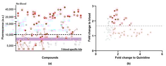 Results of the secondary screen of a natural compound library (n = 66) against third-stage larvae N. brasiliensis with reference to quinidine as positive control (QND, 32 replicates per plate) and to DMSO 1% as negative control (DMSO, 32 replicates per plate). All test and positive control compounds were tested at 100 µM in the presence or absence of blood in duplicates. Each grey or red dot represents an individual test compound. Mean +/− SD for controls were calculated as an average of all replicates (n = 224) and are indicated in purple for DMSO. All values were normalised for each plate to mean (DMSO) + 3 ∗ SD(DMSO) = 10,000 units (Dashed black line). Red dots are compounds identified as hits in presence of blood (39 compounds, screen 2, as described in Figure S1). (a) Normalised fluorescence intensity obtained for each of the 66 hits in absence of blood. (b) For each of the 66 compounds, the fold change of Sytox green intensity between screen 2 (in presence of blood) and screen 3 (in absence of blood) is represented as a function of the Sytox intensity as compared to the reference drug quinidine in presence of blood. The dash grey line has been set manually to separate hits with the higher fold change between absence and presence of blood.