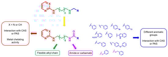 In our previous works, we synthetized and studied new molecules, characterized by two small aromatic moieties separated by various functionalized linkers, designed as new dual binding AChE and BChE inhibitors, able to bind both CAS and PAS of the enzymes, as well as being endowed with other properties, such as anti-aggregating activity, chelating and antioxidant abilities, which are potentially interesting in the light of the multifunctional nature of AD [30,31,32]. From these molecules, we recently developed some derivatives constituted by a 2-amino-pyrimidine or a 2-amino-pyridine moiety connected to various aromatic groups by a flexible amino-alkyl linker [32]. In this way, we obtained mixed ChEs inhibitors, in which the two aromatic moieties and the amine group inserted into the linear alkyl chain are able to interact with the amino acids located in the CAS, PAS and mid-gorge cavities by means of π−π stacking and π−cation interactions, acting as dual binding site inhibitors, as highlighted by in silico analyses. Moreover, the 2-amino-pyrimidinic or 2-amino-pyridinic moieties confer chelating activity to the compounds, due to the presence of the two adjacent nitrogen atoms. Noteworthy, these molecules are also characterized by low toxicity toward human brain cells and good predicted physicochemical and ADME parameters.