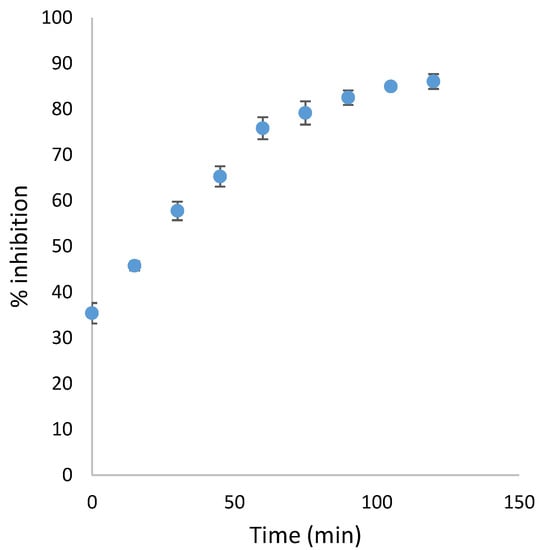 To monitor the progressive increase over time of the eqBChE inhibition exerted by compound 18, the most potent eqBChE inhibitor among these carbamate derivatives, the percentages of inhibition were determined every fifteen minutes for two hours, at the inhibitor concentration equal to 700 nM, in presence of 0.0833 U/mL of enzyme and 100 µM of acetylthiocholine. These inhibition percentage values were used to construct the graph related to the time-dependent inactivation of the eqBChE by carbamate 18, reported below (Figure 2).