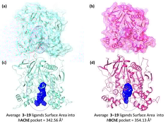 Superposition of all synthesized ligands into (a) hAChE and (b) hBChE binding pocket, surrounded by a blue circle. The ligands are illustrated as grey carbon ball and sticks representations. Panels (c,d) are focused on the solid ligand surface (blue) occupied by all compounds in hAChE and hBChE, respectively. The average 3–19 ligands’ surface area in both the hAChE and hBChE pocket are reported below each 3D representation.