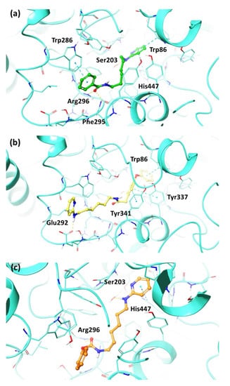 Regarding hAChE, the pyridine group of the compound 12 (Figure 4a) formed two π–π stacking interactions with His447 and Trp86, while the amine reached Ser203 through a water bridge. Instead, the phenyl ring bound Trp286 by a π–π stacking and the amide portion contributed to the accommodation at the mid-gorge pocket by means of two H-bonds with Phe295 and Arg296 backbone atoms. The growth size of the compound 14 due to the presence of the 4-phenoxybenzyl ring (Figure 4b) led to an opposite orientation with respect to the others binding poses, characterized by three π–π stacking interactions with Trp86, Tyr337 and Tyr341. Conversely, the amine group engaged a H-bond with Glu292. Concerning compound 18 (Figure 4c), the carbamate group pointed towards the backbone of Arg296, the pyridine moiety was stabilized by a π–π stacking interaction with His447 and the amine portion interacted with Ser203 by means of a water bridge.