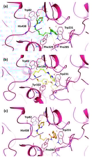 Specifically, the pyridine moiety of compound 12 (Figure 5a) created a π–π interaction with Trp82, while the amine portion engaged a hydrogen bond with His438. Furthermore, two π–π interactions were formed between the phenyl group and Trp231 and Phe329 residues, and an additional H-bond between the N atom of the amide and Pro285 backbone was observed.