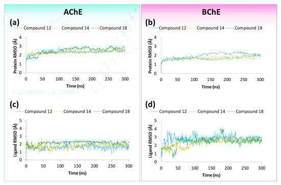 Protein RMSD and Ligand RMSD plots of compounds 12, 14 and 18 to (a,c) hAChE and (b,d) hBChE, respectively.