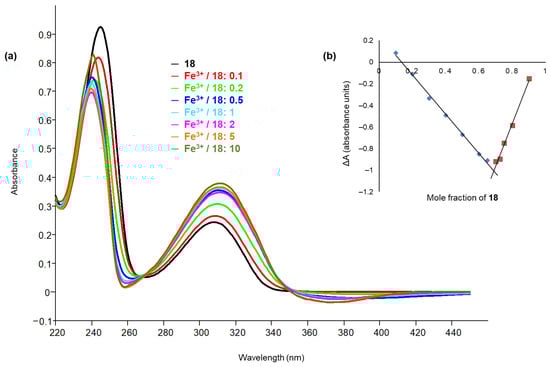 (a) UV–Vis titration of ligand 18 with Fe3+. The greatest variations in spectra with increasing amount of metal are observed at 245 nm, with a reduction of absorbance, and at 310 nm, with an increase of absorbance. There are two isosbestic points at 267 and 353 nm. (b) Job’s plot of compound 18 in presence of Fe3+: variation of the absorbance (ΔA) at the wavelength of 245 nm, in ordinate, versus the mole fraction of 18, in abscissa. X (mole fraction that causes the maximum variation of absorbance) = 0.69; n (number of ligand molecules per cation) = 2.