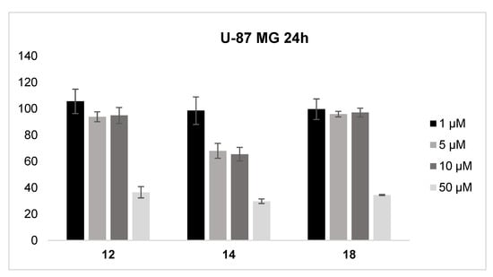 Compounds 12, 14 and 18 were tested to evaluate the cytotoxic effects on U-87 MG Cell Line from human brain (glioblastoma astrocytoma) at concentration ranging from 1 to 50 µM. The obtained data, represented in the histogram of Figure 8, suggest that the tested compounds are characterized by low toxicity towards the studied cells; in particular, compounds 12 and 18 showed a similar dose related toxicity profile, providing a cell viability over 90% up to a concentration equal to 10 µM and above 35% at 50 µM; instead, compound 14 showed a cell viability above 65% at 10 µM and 30% at 50 µM.