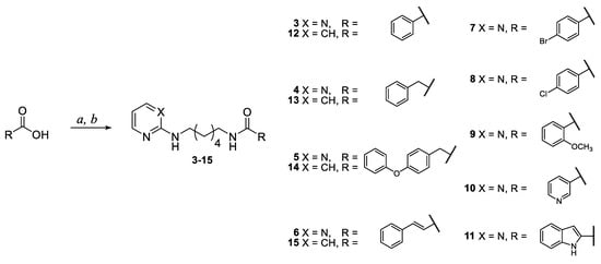 Synthesis of pyrimidine and pyridine amide derivatives 3–15. Reagents and conditions: a CDI (1 eq), CH3CN, reflux, 5 h; b N1-(pyrimidin-2-yl)hexane-1,6-diamine (1) (for 3–11) or N1-(pyridin-2-yl)hexane-1,6-diamine (2) (for 12–15) (1 eq), reflux, 18 h.