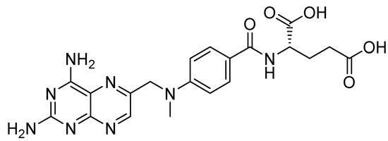 Among chemotherapeutic drugs, methotrexate (MTX, 2,4-diamino-N10-methyl propyl glutamic acid) is one of the most valuable and widely used for different types of cancer, such as leukemia, lymphoma, breast cancer, hepatocarcinoma, osteosarcoma, and gastric cancers (Figure 1) [3,5,6,7]. Several studies reported that MTX has a considerable potency as an antifolate, anticancer, immunosuppressive, anti-inflammatory, and common antirheumatic drug [5,8]. MTX is also used, along with other medications, to improve rheumatoid arthritis treatment [9,10,11]. The anticarcinogenic effects of MTX have been attributed to its ability to induce apoptosis by targeting caspase-dependent and caspase-independent cascades to trigger a significant stimulation of Fas and Fas-L expression to cause DNA fragmentation in carcinogenesis cells [12,13,14]. Furthermore, MTX activates nuclear factor-κB (NF-κB) and p38 pathways, which regulate cell apoptosis [15].