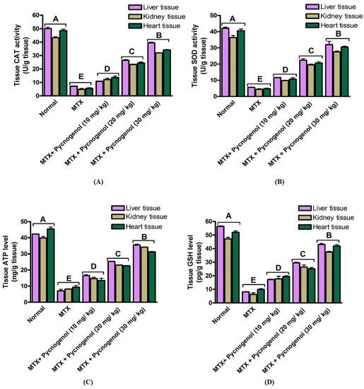 Effect of pycnogenol and/or MTX treatment on (A) CAT, (B) SOD, (C) ATP, and (D) GSH oxidative stress biomarkers (mean ± SD) in different organs. Data are mean ± SD of six rats/group. CAT: catalase, SOD: superoxide dismutase, ATP: adenosine triphosphate, GSH: reduced glutathione. p-value < 0.05 is significant. Bars represent the mean value and the standard error for means. Bars with different letters are significantly different according to DMRTs at p = 0.05.