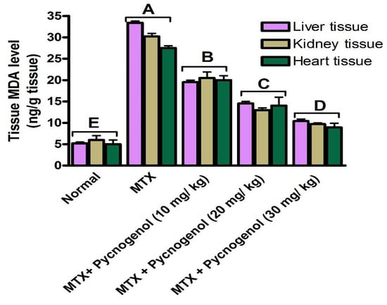 To affirm our findings of the effect of pycnogenol on the MTX-induced oxidative stress, we assessed the lipid peroxidation marker, MDA level (ng/g tissue), in the liver, kidney, and heart tissues. As illustrated in Figure 4, MTX treatment significantly increased (p < 0.05) the level of MDA (ng/g tissue) compared with the normal group. These results, in agreement with previous reports, confirm the effect of MTX on the antioxidant system, which led to an increase in the lipid peroxidation of different tissues. To further explore the antioxidant activity of pycnogenol, we evaluated the MDA biomarker in the liver, kidney, and heart tissues of the pycnogenol-treated groups. Consistent with our previous findings, administration of pycnogenol significantly (p < 0.05) and dose-dependently reduced the MDA level in the different tissues compared with the MTX group, with 30 mg/kg as the most effective dose. Taken together, the presented findings support the protective effect of pycnogenol against MTX-induced oxidative stress and lipid peroxidation in the different tissues (Figures S2–S4).