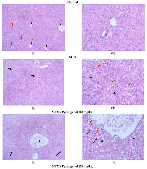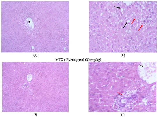 Stained H&E liver sections of the normal group showed normal hepatic cell architecture, each with a well-defined cytoplasm, prominent nucleus, nucleolus, and a well-defined central vein; the hepatocyte stands radiated from it separated by sinusoids with unremarkable pathological changes (Figure 5a,b). Stained H&E liver sections of the group treated with MTX showed obvious histological damage, and the architecture of the tissues was impaired, as there were multiple areas of confluent necrosis with occasional porto-central bridging necrosis in the stained sections. Moreover, hepatocytes showed evidence of injury as fatty changes, hydropic degenerations, and foci of lytic necrosis (Figure 5c,d). In groups treated with pycnogenol prior to MTX treatment with gradient concentrations of pycnogenol, the stained H&E liver sections revealed the hepatoprotective effect of pycnogenol, as there was an improvement in liver architecture, with no sign of hepatocyte injury, a decrease in fatty changes, hydropic degeneration in the hepatocytes, and no evidence of necrosis in a dose-dependent manner (Figure 5e–j).
