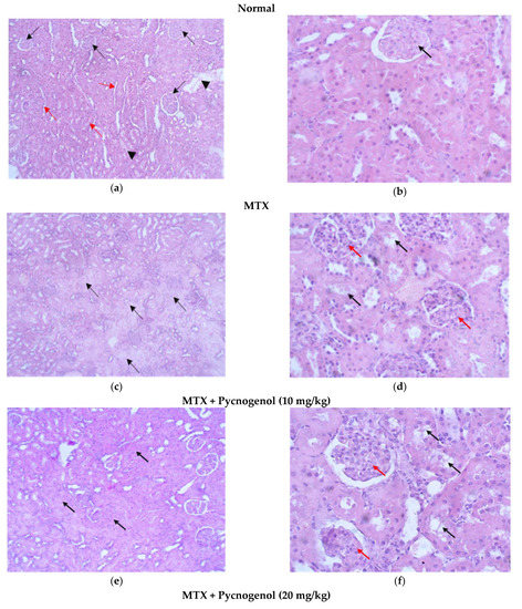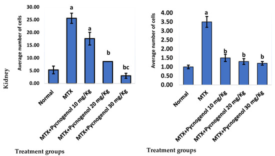 Toward the evaluation of MTX effect on kidney function, we assessed the levels of urea and creatinine (mg/dL) in the serum. As shown in Table 1, MTX treatment demonstrated a significant increase at p < 0.05 in serum urea and creatinine compared with the normal group. These results imply that treatment of MTX caused renal failure, which led to an increase in the level of both serum urea and creatinine (mg/dL). On the other hand, administration of pycnogenol at different concentrations (10, 20, and 30 mg/kg) before MTX treatment significantly improved serum kidney function. As shown in Table 1, pycnogenol treatment showed a significant (p < 0.05) dose-dependent decrease in the serum urea and creatinine levels (mg/dL), with 30 mg/kg dose as the most effective. These results indicate that pycnogenol treatment has a protective effect against MTX-induced toxicity in the kidney (Figure S1).