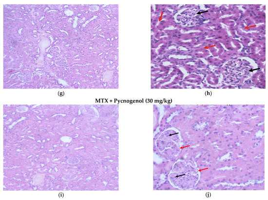 Stained H&E kidney sections of the normal group showed renal corpuscles with regular glomeruli and an intact Bowman’s capsule with proximal and distal convoluted tubules with normal wall thickness and patent capillary lumens; surrounding tubules reveal no signs of injury (Figure 6a,b). Stained H&E kidney sections of the group treated with MTX showed obvious histological damage, the architecture of the tissues was impaired, and tubular injuries appeared as multiple foci in the tubules. In addition, the tubular outlines were disturbed, the brush borders were lost, the linings of cells was detached from the lumen, and cytoplasmic vacuolization and blebbing of the cell’s membrane occurred. Moreover, there was a mesangial expansion with mild thickening of the capillary wall, leading to enlargement of glomeruli (Figure 6c,d). Stained H&E kidney sections in groups treated with pycnogenol before MTX treatment with gradient concentrations of pycnogenol proved the renal protective effect of pycnogenol. The multiple foci percentage of pycnogenol decreased in a dose-dependent manner, indicating the decrease in the tubular injury. The tubules were tightly packed, with uniform epithelial lining and uniform cytoplasm; glomeruli appeared enlarged and showed mesangial expansion with mild thickening of the capillary wall (Figure 6e–j).