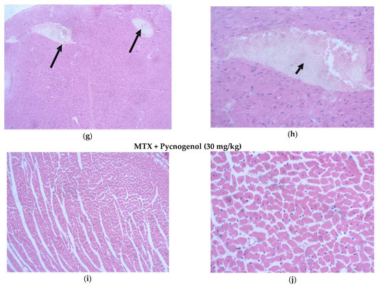Stained H&E heart sections of the normal group showed regular cell distribution and a normal myocardium architecture with uniform muscle bundles; cells had central nuclei (Figure 7a,b). Administration of MTX caused impairment in the architecture of cardiac tissues, with the appearance of a small percentage of hemorrhagic myocyte necrosis, myocyte vacuolization, and disappearance of nuclei in some myocytes. Moreover, lymphocytes were infiltrated in some areas of cardiac tissues (Figure 7c,d). Administration of pycnogenol in different concentrations affirmed the cardioprotective effect in a dose-dependent manner. Treatment with pycnogenol caused a decrease in the necrotic areas with no signs of myocyte injury and restoration of normal cardiac appearance (Figure 7e–j).