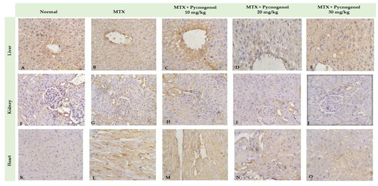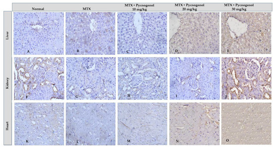 In order to confirm our biochemical findings, the effect of MTX treatment on the liver, kidney, and heart tissues, as well as the possible protective effect of pycnogenol administration, was determined using light microscopic examination of the histopathological and immunohistochemical changes.