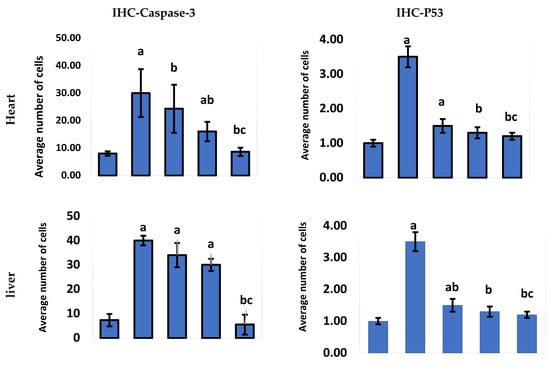 Immunohistochemical staining with IHC-caspase 3 and IHC-P53 of heart, liver, and kidney tissue. Differences assessed by Kruskal–Wallis test at p = 0.05. a Significantly different from normal group. b Significantly different from MTX group. c Significantly different from MTX + pycnogenol (10 mg/kg).