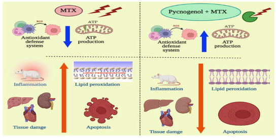 Illustration of the protective effect of pycnogenol on MTX-induced toxicity in different organs.