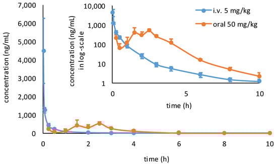 | i.v. (5 mg/kg) (n = 3) | Oral (50 mg/kg) (n = 3) | |